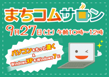 2014年9月27日(土)午前10時~12時 府中グリーンプラザ地下会議室にて開催 参加費500円  今回は府中まちコム舎のメンバーが「パソコンをもっと速くしよう」と「WindowsXPをWindows7にしよう」という…