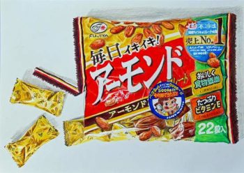 2021年2月6日(土) 超リアルな色鉛筆画がテレビやインターネットで流行っている。 外出もままならない今、手近な題材を見つけに菓子売り場に行った。ペコちゃんマークが入ったチョコ菓子がカラフルで文字の表現も面白く興味が湧…