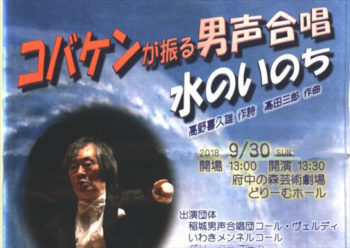 2018年9月30日(日)  府中の森芸術劇場どりーむホールで多摩地域の男声合唱団の合同コンサートが開かれた。指揮はコバケンこと小林研一郎。「炎のマエストロ」と称される世界的指揮者だそうだ。  ケンコバなら知っているんだ…